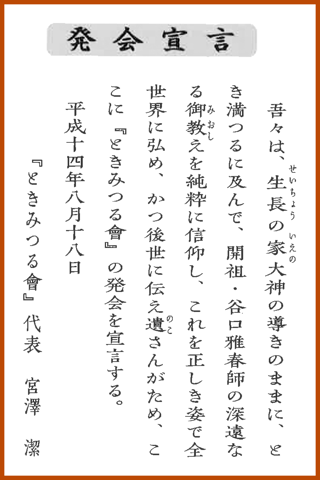 宗教法人『ときみつる會』は、宗教法人「生長の家」とも、宗教法人「谷口雅春先生を学ぶ会」とも、全く別個の独立した団体です。