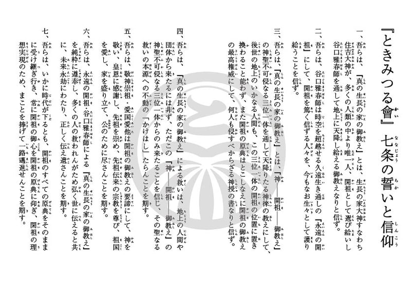 ときみつる會が目指すことは、〝生長の家の御教え〟を立教された谷口雅春先生を開祖と仰ぎ、その御教えを遵奉し、開祖を尊崇してお志を継承しつづけ、開祖の目指された理想を実現することです。掲げる「信条」は下記です。